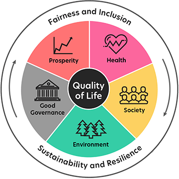 Le problème est que les considérations économiques prennent souvent trop d’emphase aux détriments d’autres considérations. La recherche démontre qu’il y a en gros cinq facteurs importants qui affectent notre qualité de vie: notre situation financière, notre santé physique et mentale, notre sentiment d’appartenance à une communauté, la qualité et la beauté de notre milieu de vie et la qualité de notre gouvernance. Il est aussi important de s’assurer que tous les gens bénéficient relativement également d’une bonne qualité de vie – encore une fois c’est le statut relatif qui importe – et que cette qualité de vie soit soutenable pour les générations futures. Et tous ces facteurs sont interreliés à travers un système complexe. L’économie ne peut être forte si plein de gens ont des problèmes de santé mentale, un gouvernement corrompu, ou ne se font pas confiance les uns envers les autres. Et une économie forte permet à tous d’avoir un travail valorisant, un déterminant clé pour la santé mentale.