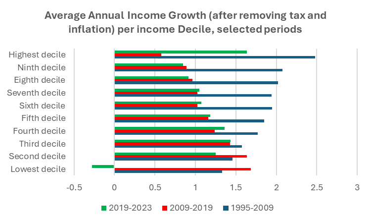 That leaves overly optimistic expectations as the likely culprit. Income grew faster than prices for most Canadians, but not as much as before. For most households, the standard of living grew about 50 per cent slower between 2009 and 2023 than between 1995 and 2009. This phenomenon extends beyond Canada and stems from a decline in global productivity growth and a reduction in the share of productivity gains accruing to workers. Current employees comparing their trajectory with their parents’ experience, or with their own earlier career progression, may perceive themselves as falling behind despite objective improvement.